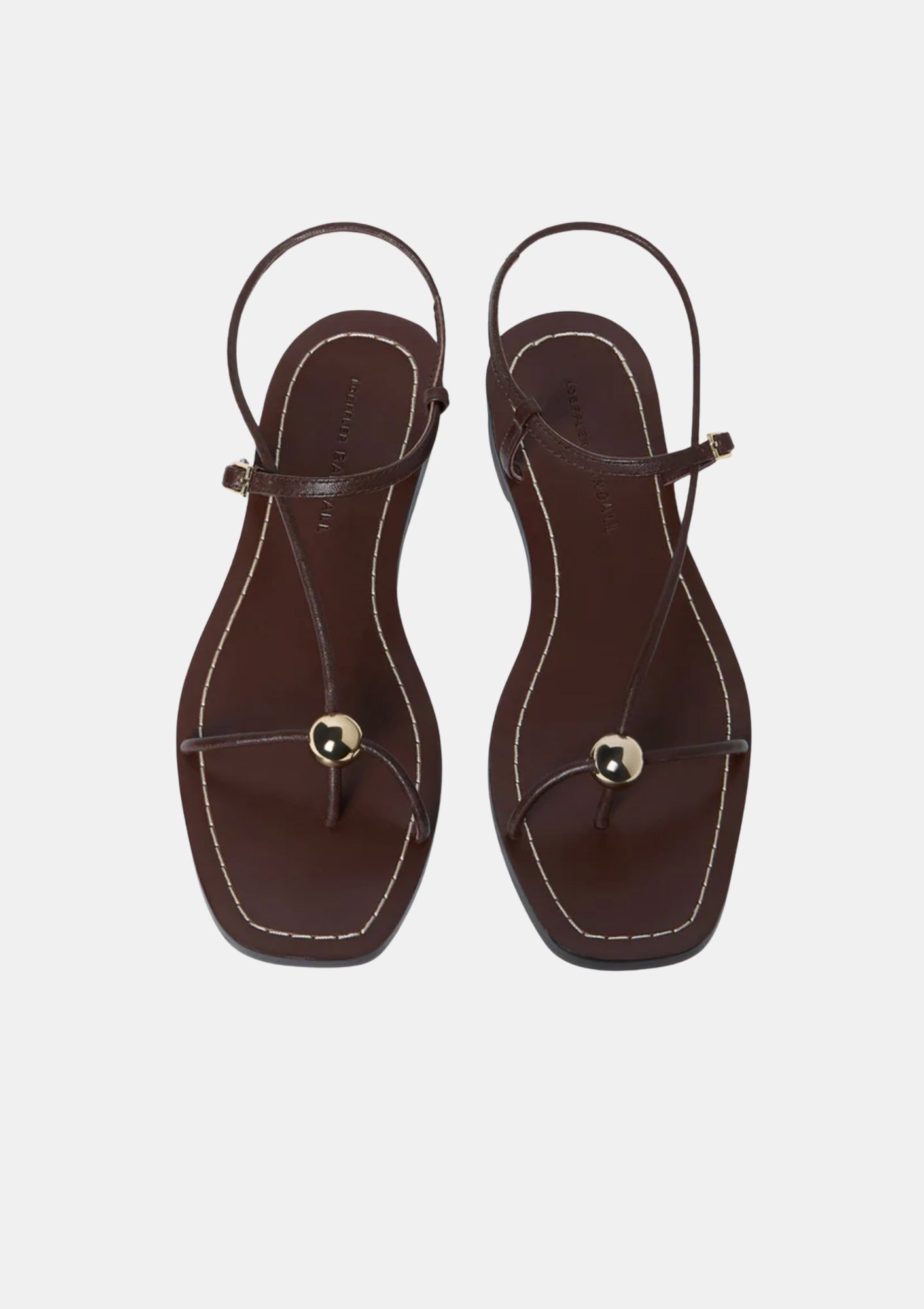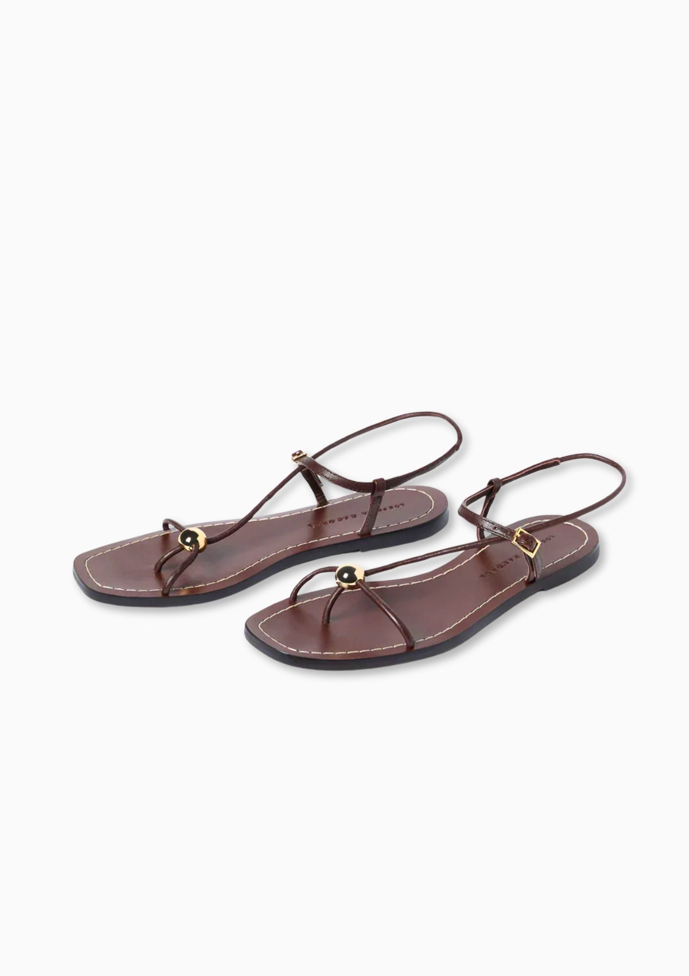 Flat sandal in espresso nappa leather. Features gold ball detail, a plank footbed, an open toe, and a delicate strap design with buckle closure.